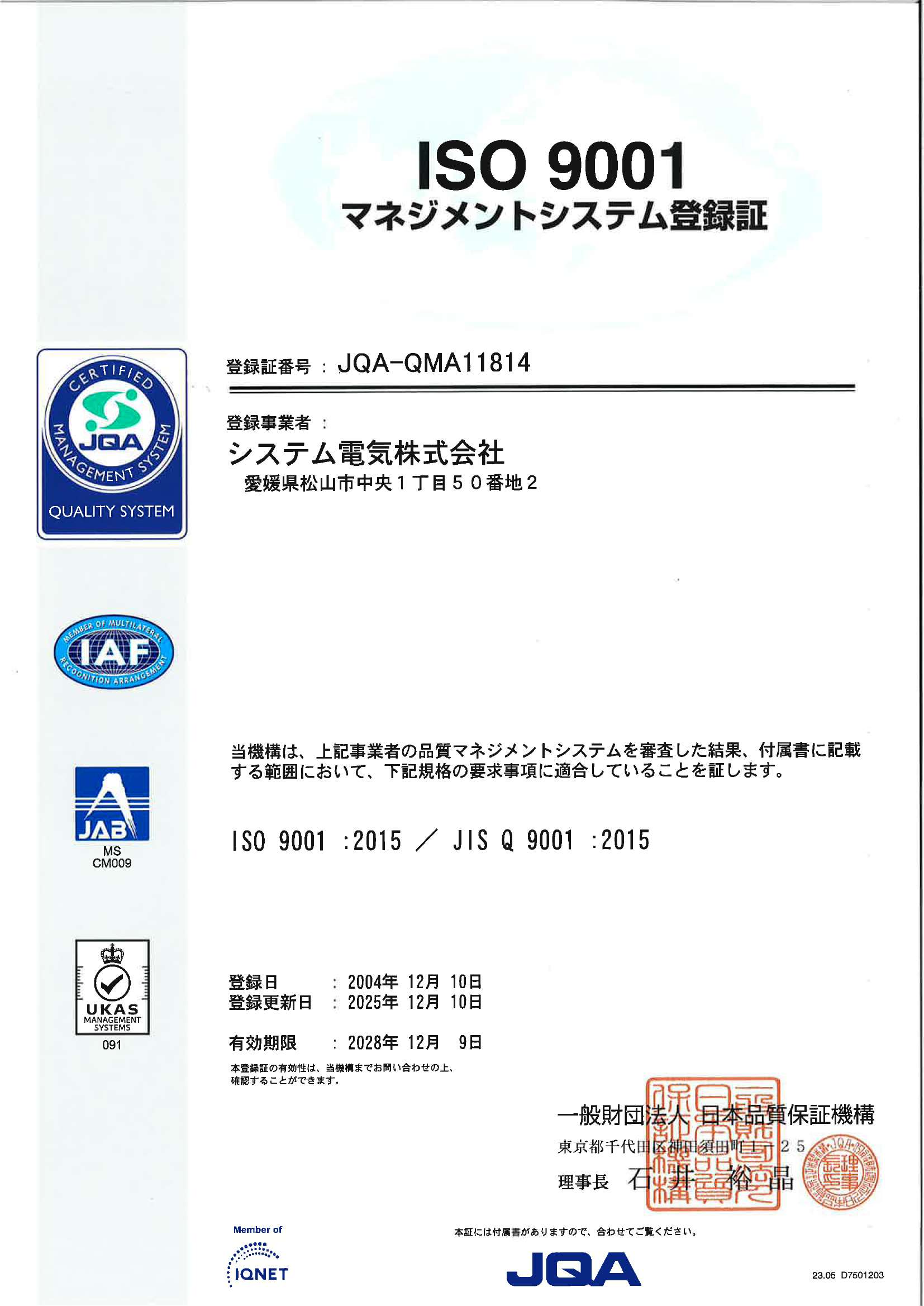 2004年 ISO9001:2000年版 登録 2010年 ISO9001:2008年版 移行 2017年 ISO9001:2015年版 移行 適用範囲:「電気設備の設計及び施工」に関する業務に適用する。 品質方針 品質はつくるもので出来たものではない ページトップ